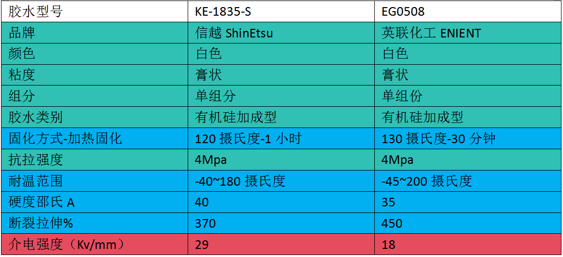 對(duì)比KE1835S膠水,EG0508擁有相同的操作和固化方式,并且強(qiáng)度相同,彈性,柔軟差異較小,同時(shí)擁有更高的耐溫范圍;差異:KE1835S的絕緣性更強(qiáng),而EG0508也達(dá)到18Kv,也已經(jīng)是較高介電強(qiáng)度。預(yù)計(jì)可以適用客戶的絕緣需求。