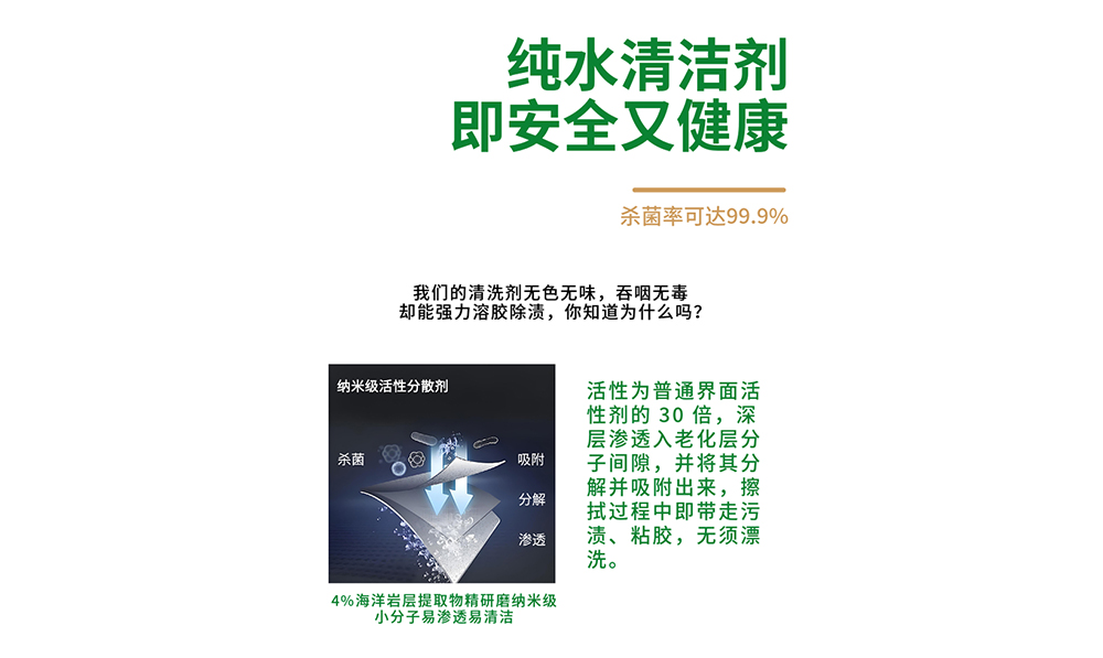 除了防護措施外,我們還可以考慮使用一些環保的替代產品。目前市場上已經出現了無色無味無VOC揮發的純天然礦物清洗修復劑,采用了來自深海巖層的天然礦物質,以純凈水為載體,這種天然環保的配方不但對人體健康沒有任何危害,而且具有納米級研磨功效,清潔效果顯著。這類產品不但在溶解老化膠層的效果上不遜色于傳統的高氣味產品,而且安全性和環保性方面具有顯著優勢。