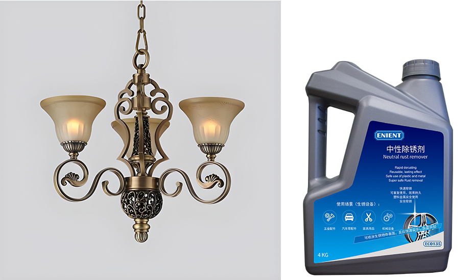 家住上海的張女士最近發現自家客廳里安裝多年的黃銅吊燈逐漸失去了光澤,表面還出現了幾塊明顯的銹斑。因為這盞吊燈是家中的重要裝飾,張女士希望能夠不損壞吊燈的情況下,徹底去除這些銹跡。在朋友的推薦下,她選擇了這款中性除銹劑。